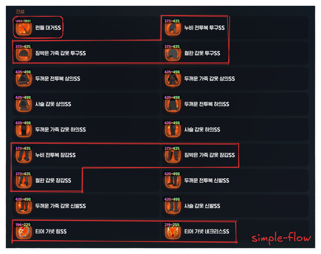 를 보면 얻을 수 있는 장비 능력치 값을 확인 가능합니다.