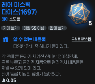 - 미스틱 다이스는 사용 시 특정 부위(무기, 방어구, 장신구 등)의 장비 아이템 1개를 획득하게 해주는 소모성 아이템입니다.
