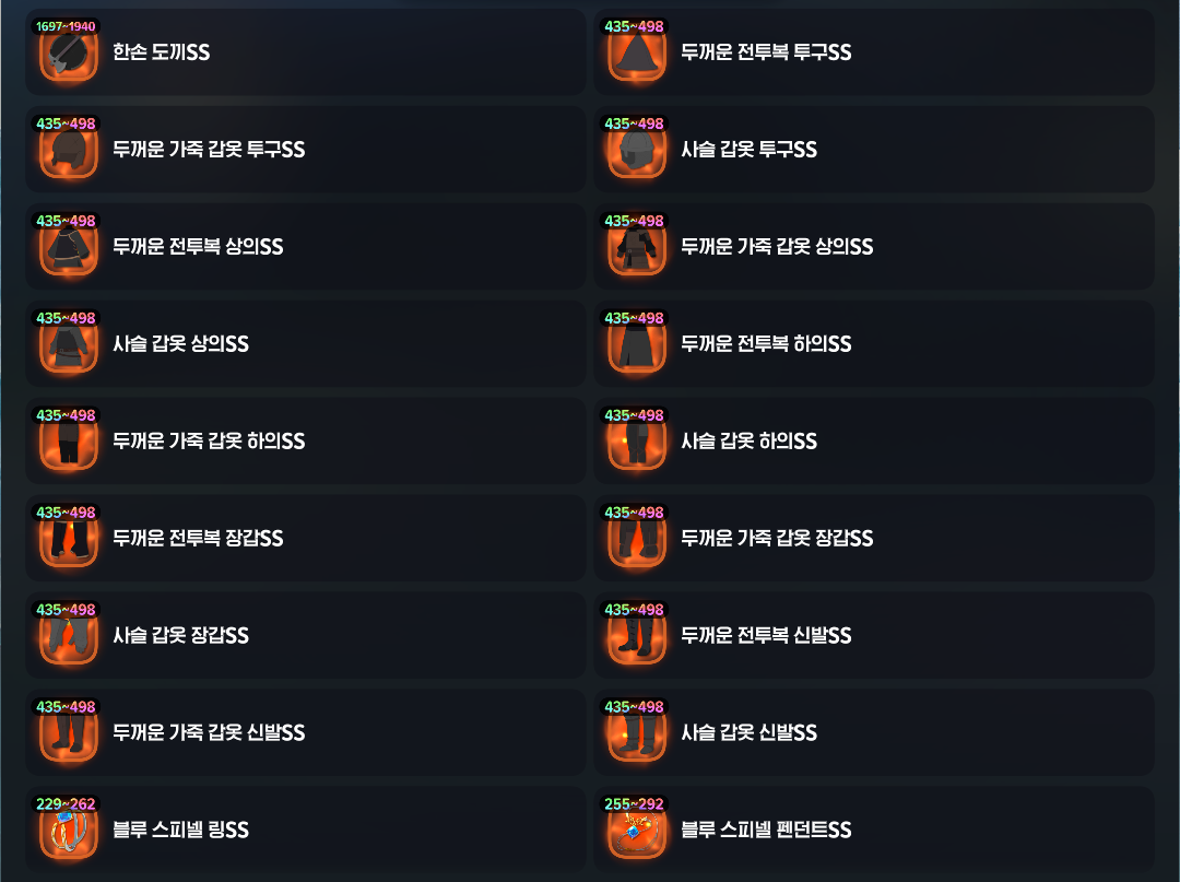 하의 | 방어력 | 373 ~ 435 |