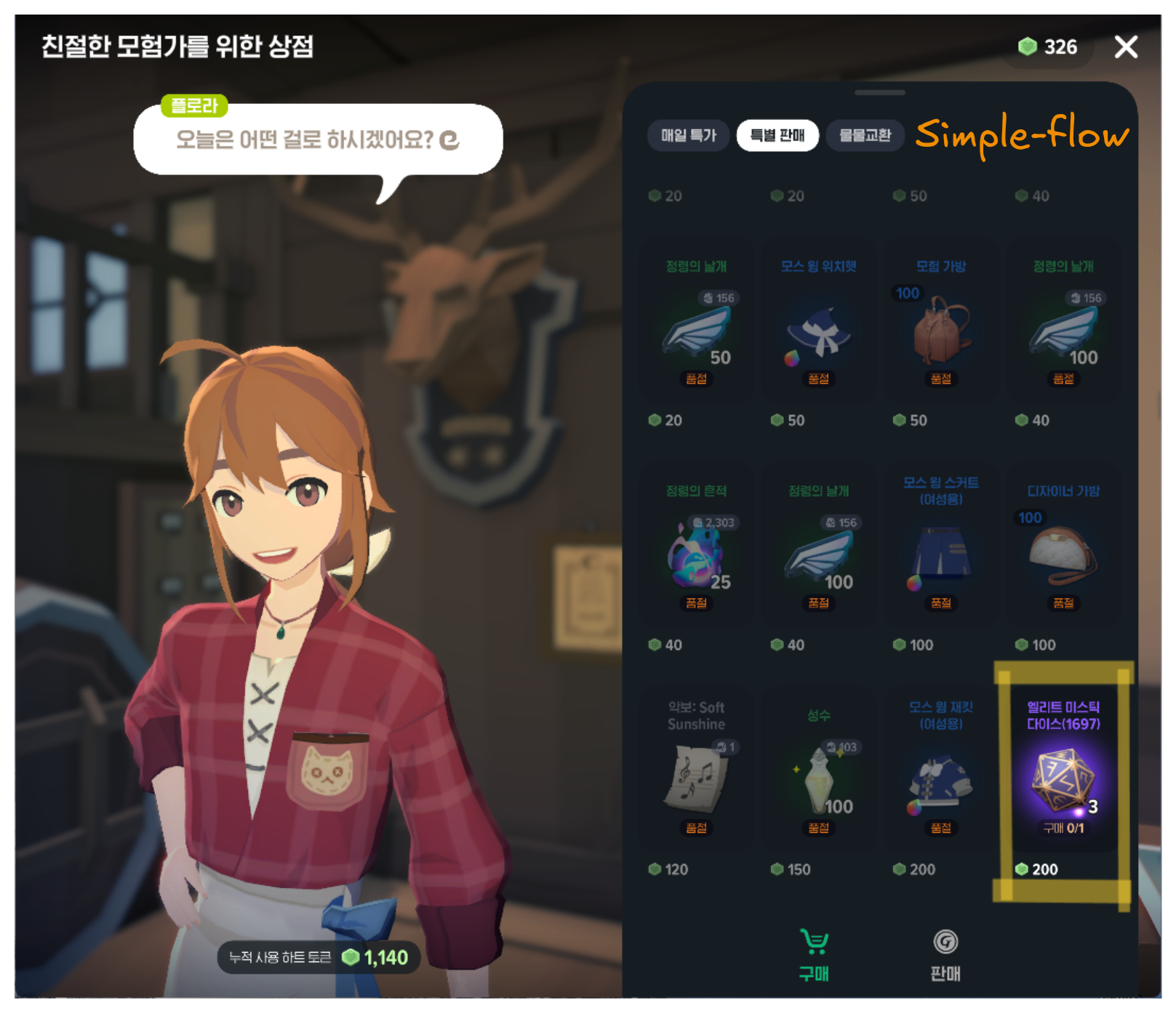 - 하트 토큰으로 교환 가능 (앞에 물품이 구매되어야 다음 물품 구매 가능)